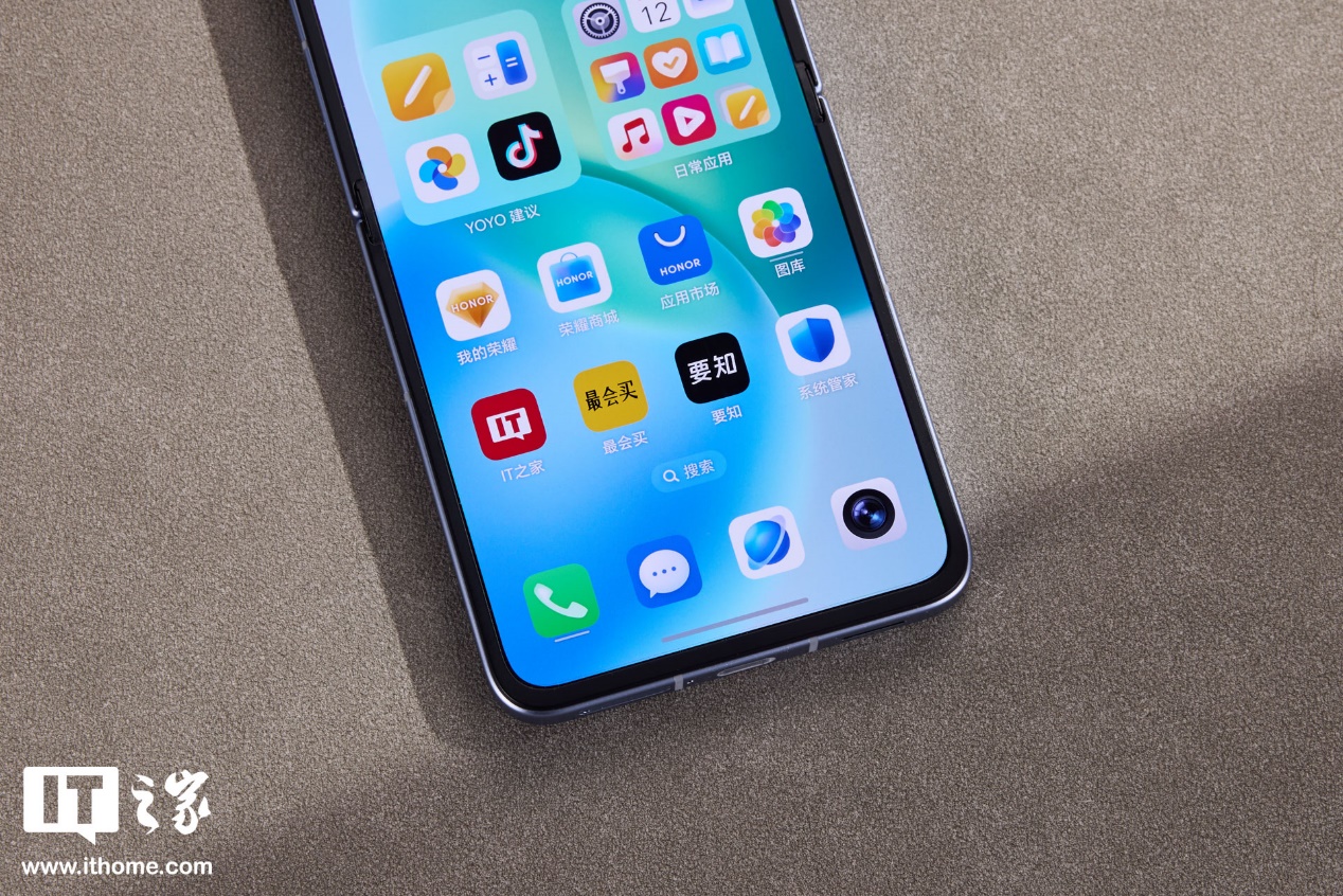 展开内屏,形态上各家都大同小异。荣耀 Magic V Flip 采用三等边外框设计,下巴略宽一点。而最重要的折痕处理上,亮屏状态下无论是看还是摸,几乎都感知不到折痕存在,就像在用一块完整直屏一样。