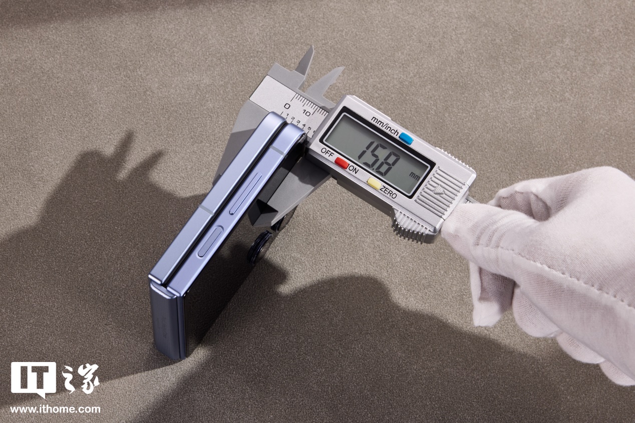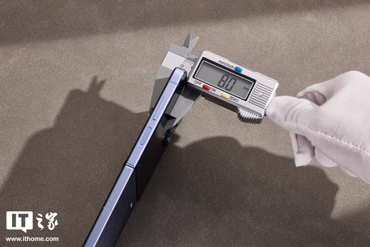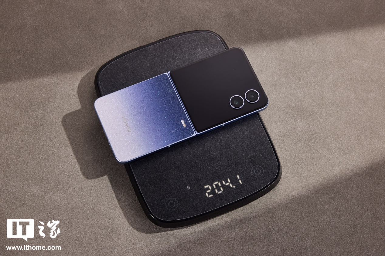 轻薄便携是小折叠的非常重要的设计属性,荣耀 Magic V Flip2 高定款也不例外。官方标称的尺寸数据为 6.82 英寸内屏,6.9mm 展开厚度,15.5mm 折叠厚度以及 204g 重量,实测数据仅供参考。