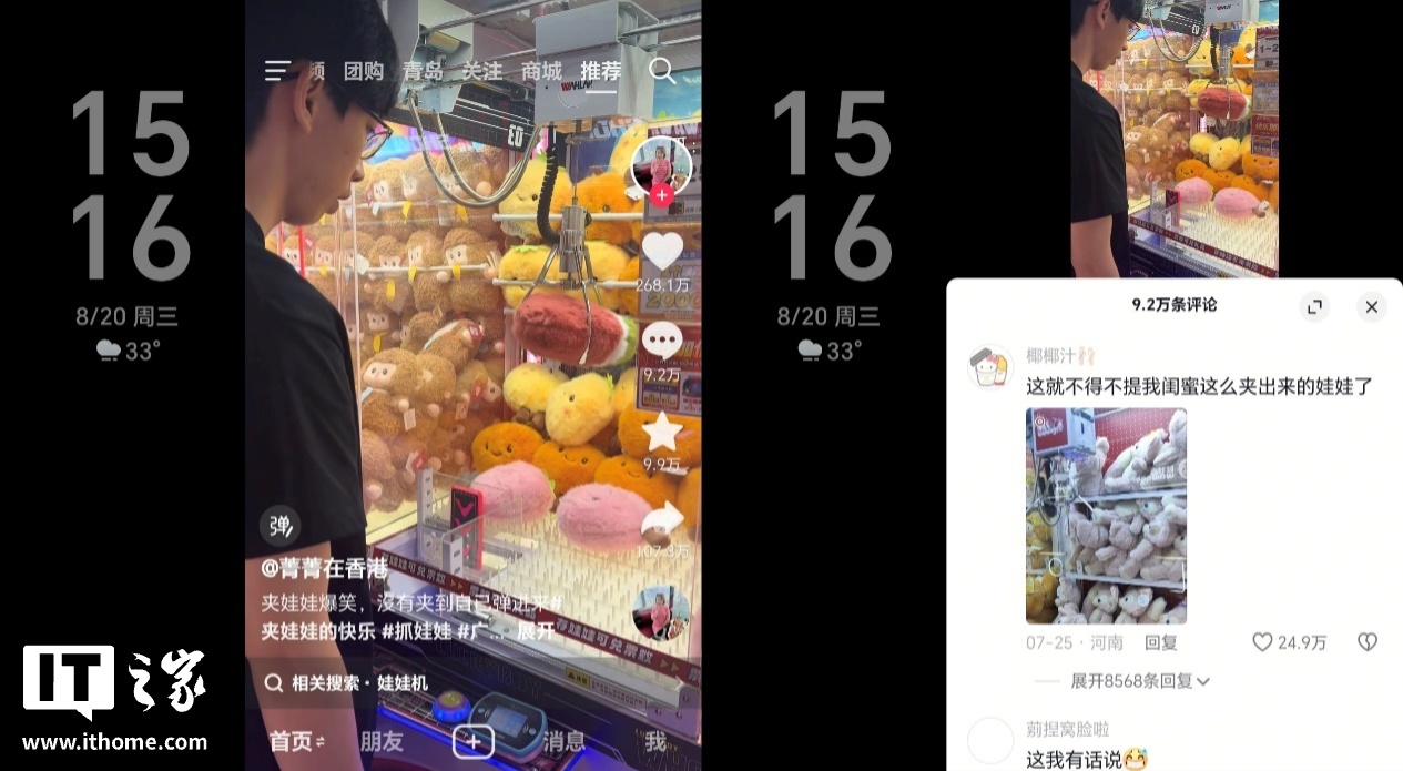 在一款 App 中同时存在浅色和深色场景,也能无缝切换。部分 App 还将左侧“闲置”区域利用起来,给予单独适配,比如点开小红书短视频内容,左侧显示笔记摘要和视频标签;天气、日历 App 会全屏显示等。