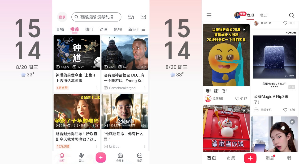 更为细节的是,荣耀 Magic V Flip2 甚至还采用了应用取色的特性,会根据应用主题色自适应调整左侧时间区域背景底色。这背后的逻辑,是荣耀通过追求内外屏一致的 App 交互体验,来提升用户的外屏使用率。