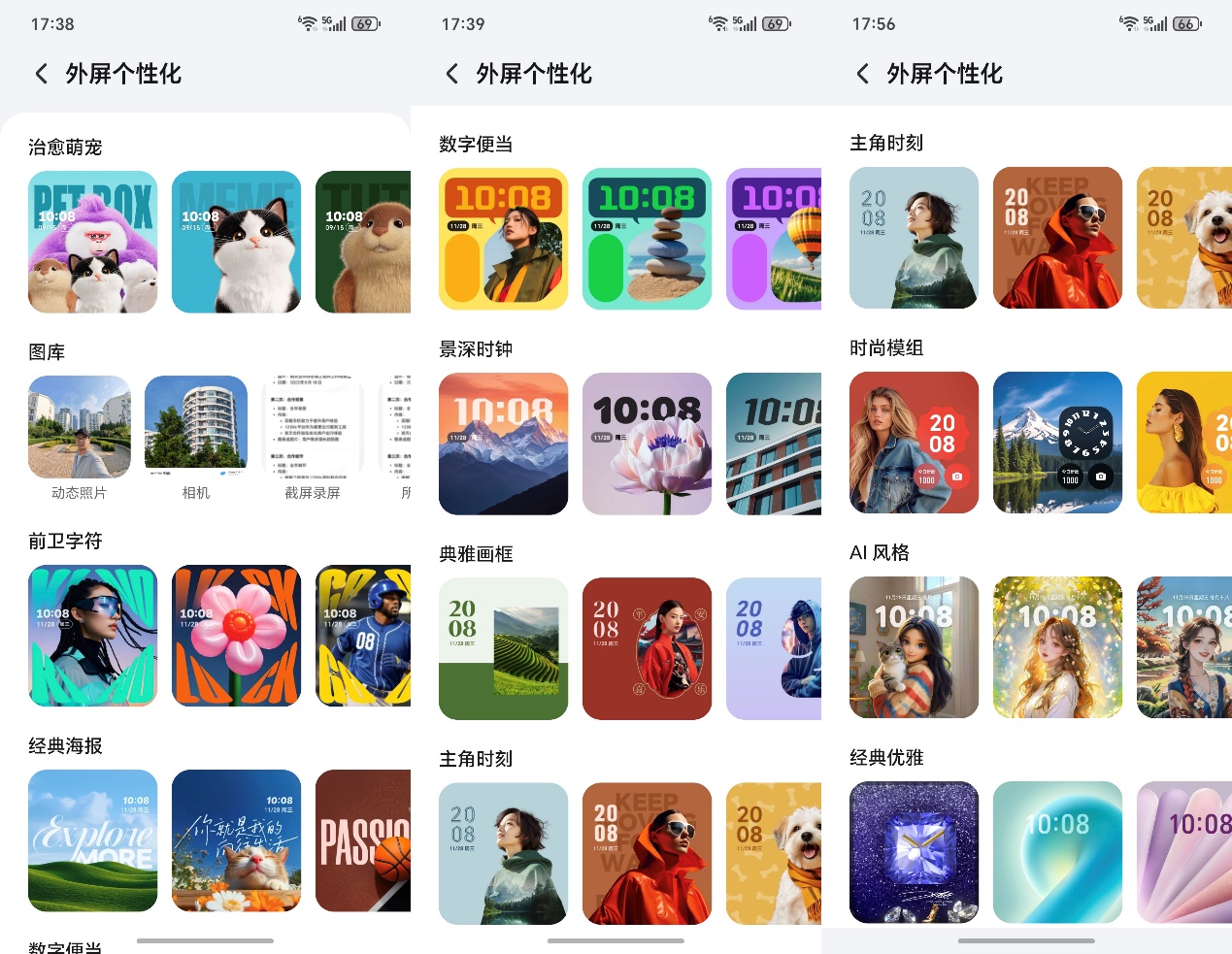 除了萌宠主题,荣耀 Magic V Flip2 还支持多种不同类型的外屏个性化锁屏主题,设置方式和前面展示的萌宠主题一样,在内屏打开设置 – 折叠屏专区 – 点击最上方主题预览图片的更换样式即可进入主题库。