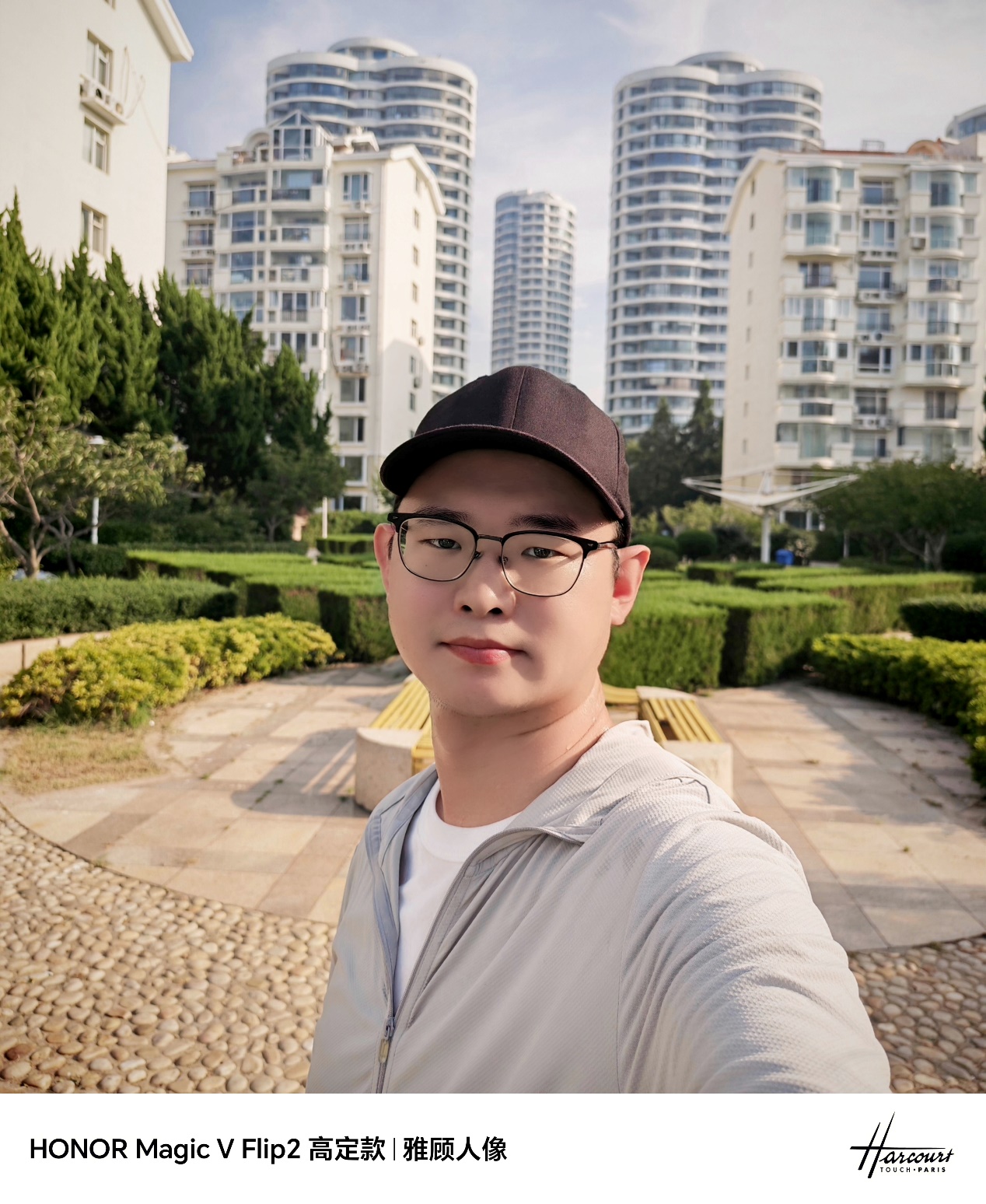 比如上面这两张就是通过外屏在默认 1x 焦距和 0.5x 超广角下使用顾雅质感风格进行自拍的效果。