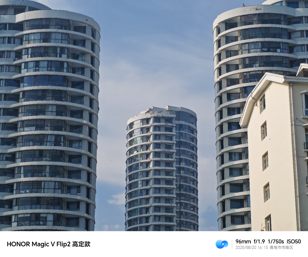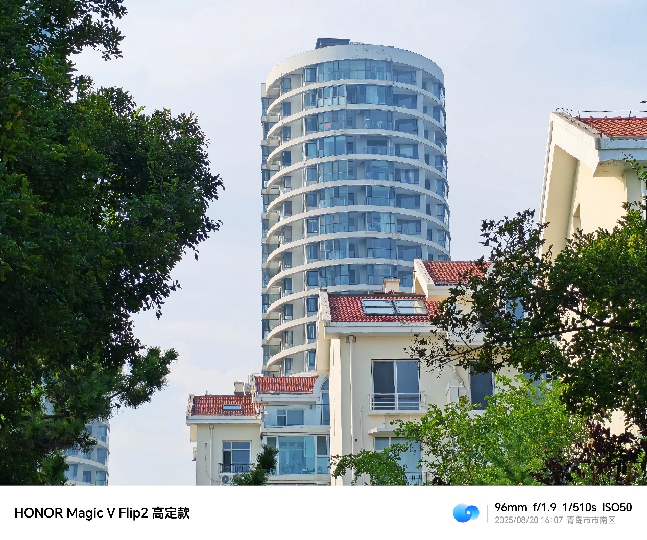 荣耀 Magic V Flip2 这次配备了一颗 2 亿像素的 AI 超清主摄镜头,拥有 f/1.9 的大光圈、最大 30 倍变焦以及 OIS 光学防抖;另一个摄像头则是 5000 万像素的 120° 超广角镜头,支持 2.5cm 超短距离对焦。