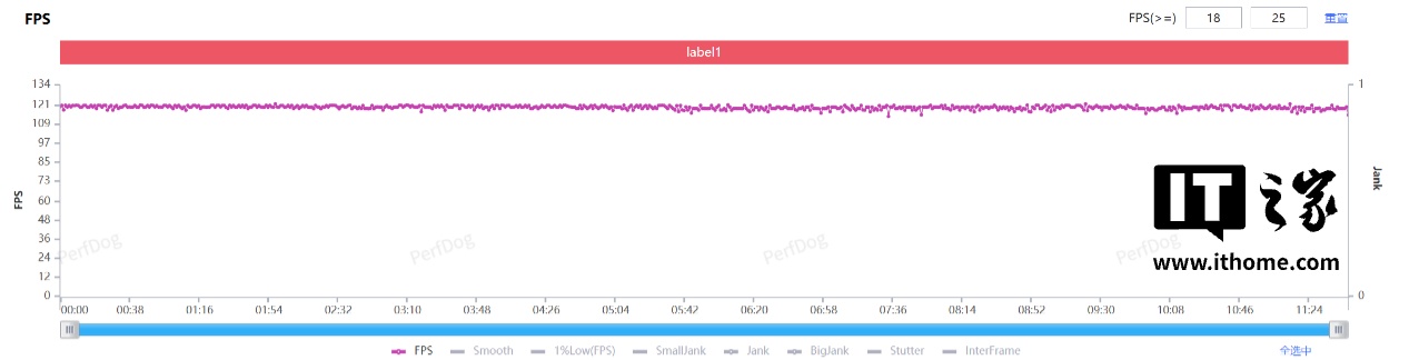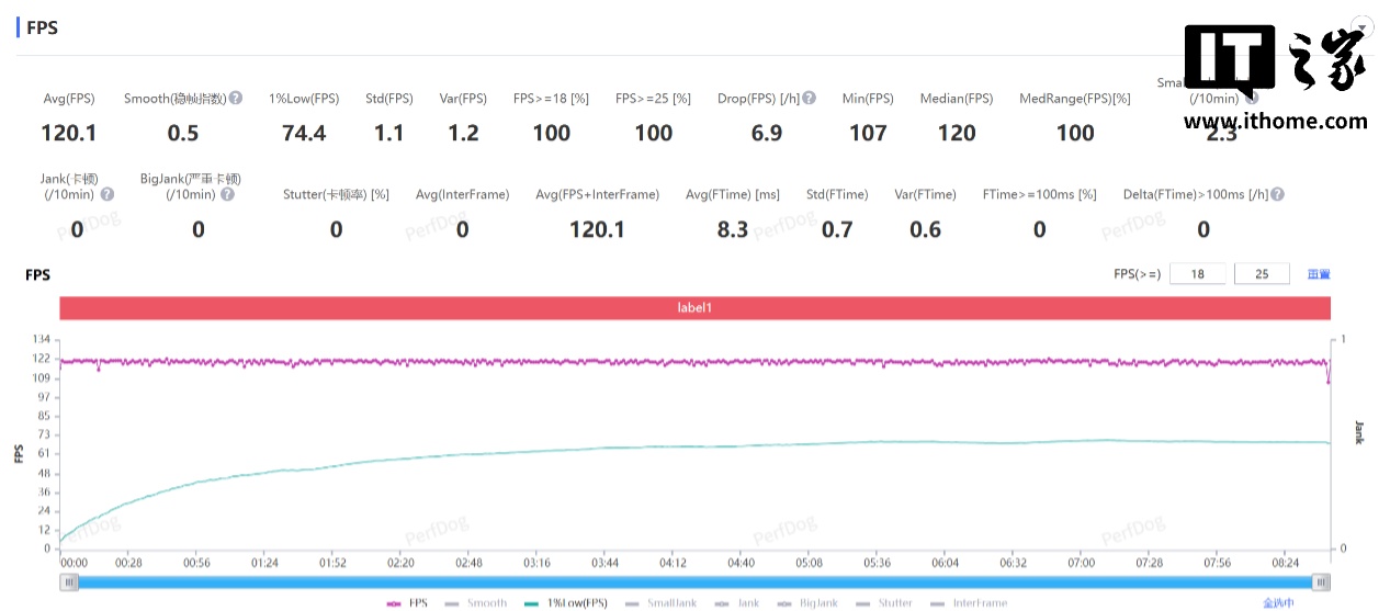 两局对战一共 20 分钟左右,游戏平均帧数均为 120 帧,帧率曲线波动很小,1% Low 帧则在 65 帧左右,游戏平均功耗 3.7W。20 分钟手机电量从 82% 掉到 74%,耗电 8%。