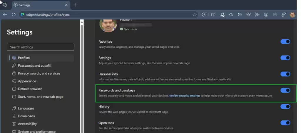 启用该功能后,Edge会在“个人资料 > 同步”设置中新增“密码和通行密钥”选项,并提示用户:“密钥将安全存储并在所有设备间可用。您可前往安全设置进一步强化Microsoft账户保护。”