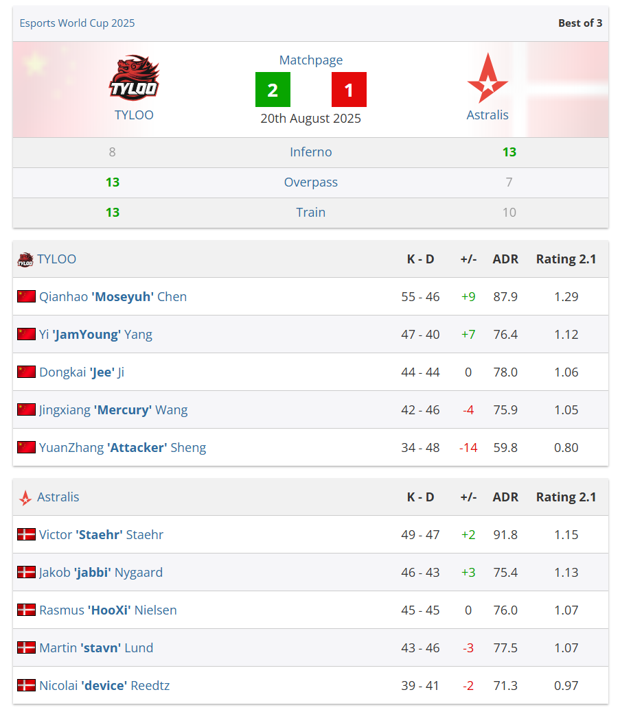 TYLOO 与 Astralis 再次在 2025 年电竞世界杯淘汰赛相遇,延续了此前三次交锋全胜的纪录。本场八分之一决赛,TYLOO 面对强势开局的 Astralis,展现出顽强的竞技状态,最终将对手淘汰出局,挺进八强。附上相关截图如下: