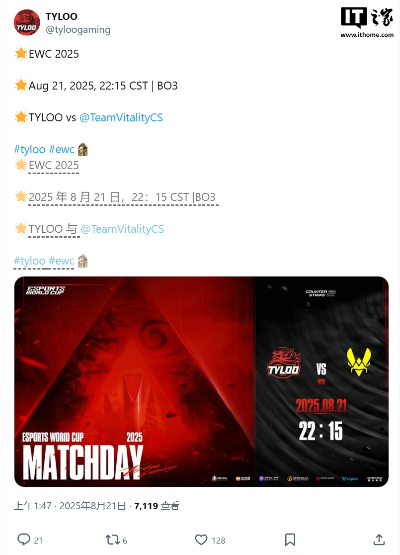 《2025 EWC 电竞世界杯进入最后一周,今晚中国战队 TYLOO 出战〈CS2〉项目》