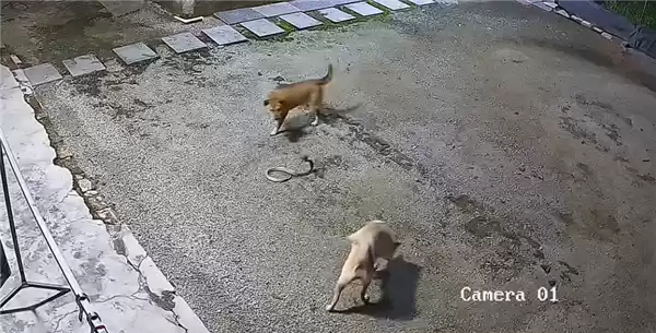监控实拍:两狗智斗眼镜蛇,一佯攻一偷袭配合默契