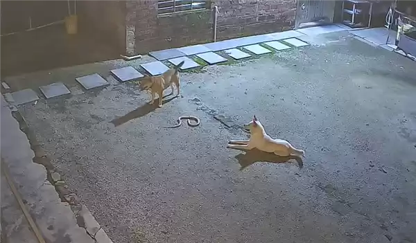 从监控画面看,此事发生在本月20日0点13分,当时院子里有两只狗,一只是黄的,一只是白的,目测都是中华田园犬,它们正在和一条溜进院里的眼镜蛇对峙。