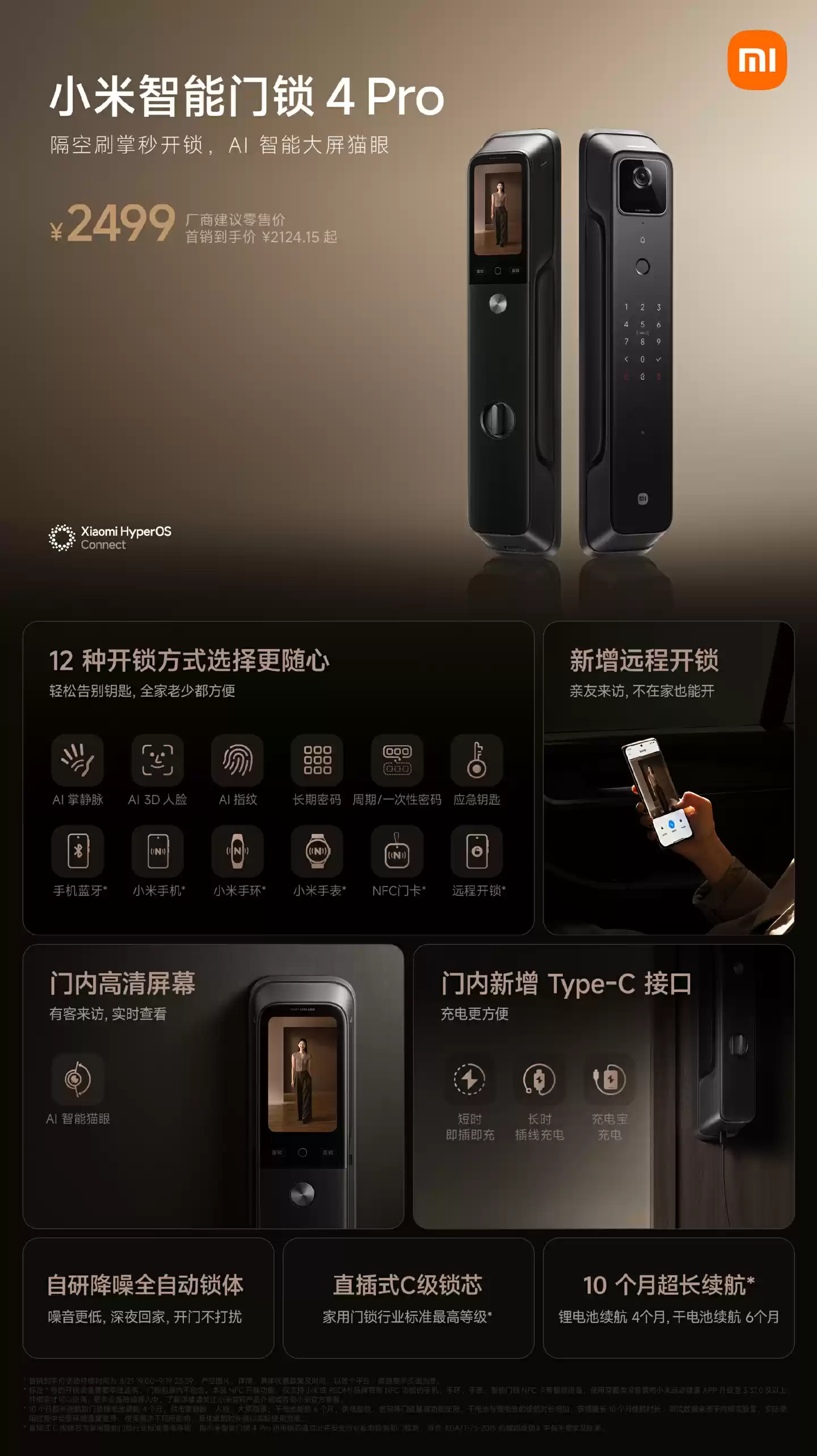 8 月 21 日消息,小米智能门锁 4 Pro 现已开售,支持 AI 掌静脉、3D 人脸识别,售价 2499 元,国补价 2124.2 元起。