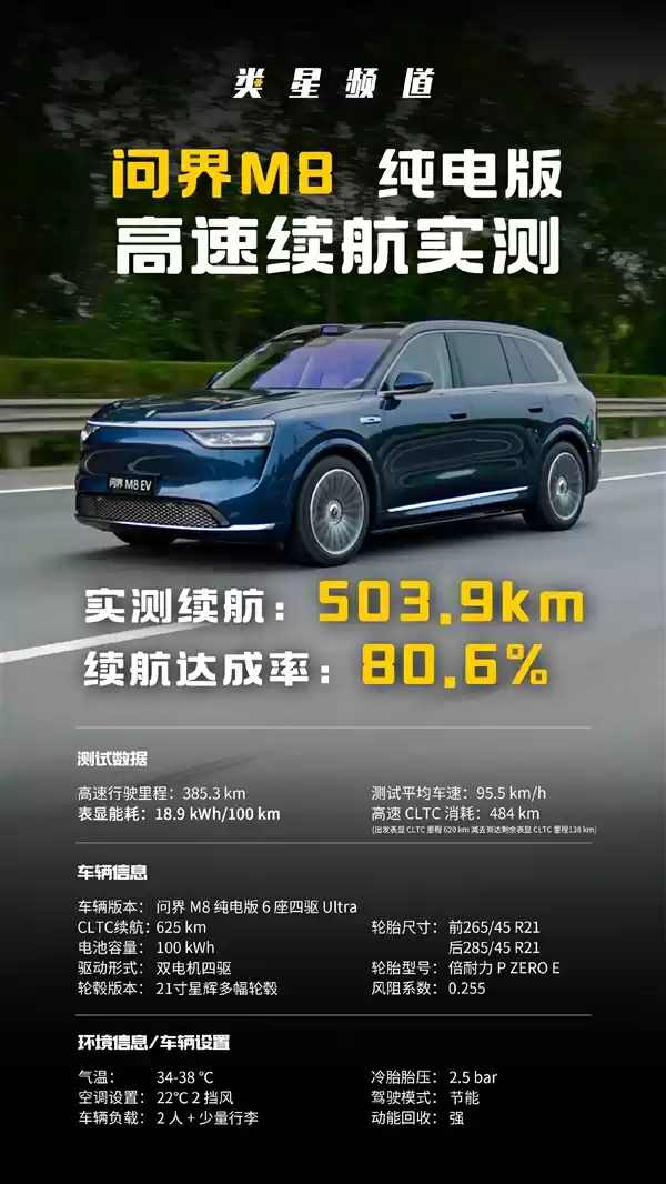 问界M8纯电版高速续航实测:大型SUV续航达成率超预期