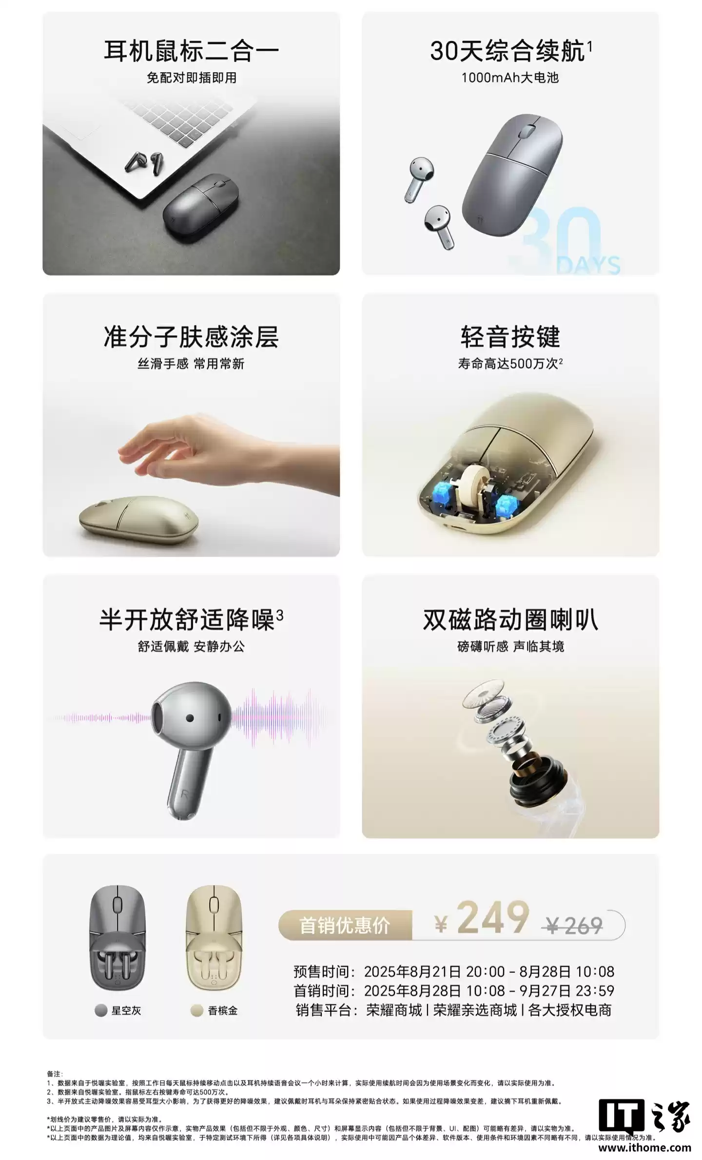 8 月 21 日消息,荣耀亲选悦喔无线耳鼠 Pro 今日开启预售,新品采用耳机鼠标二合一创新设计、支持半开放降噪功能,定价 269 元、首发 249 元。