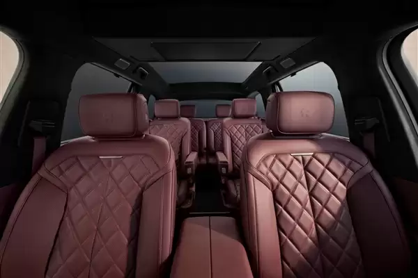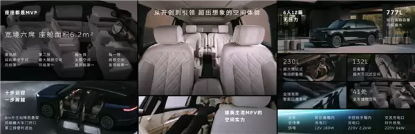 车内采用大六座布局,前排座椅可180°水平放倒,与二排座椅联动,形成全平式大沙发。同时,六座版是行业唯一配备了三把零重力座椅的SUV,包括女王副驾、后排双独立座椅,座椅靠背均支持最大151度躺角,第二排右侧零重力座椅还支持150毫米横向移动。