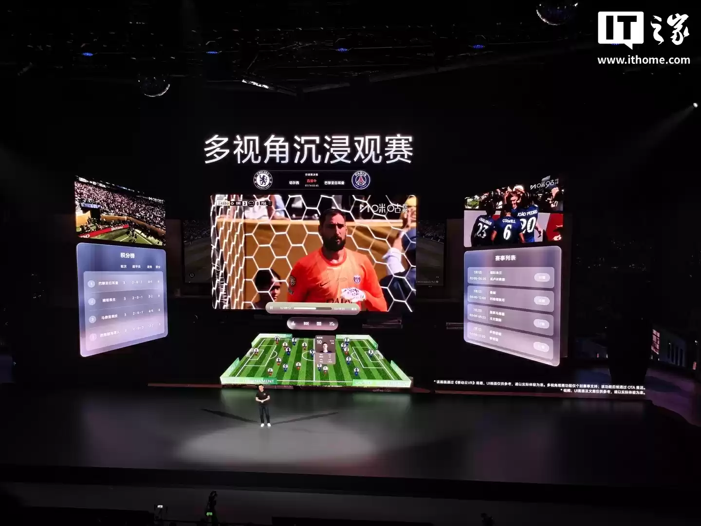 据介绍,vivo Vision 探索版主打沉浸穹幕视频、移动巨幕影院、体育赛事直播、空间影像等使用场景,拥有上下左右 180 度的视野,配合空间音频,可体验沉浸感和临场感。新头显支持 120 英尺超大巨幕画面,并与咪咕视频合作,支持实时直播观赛 + 多视角沉浸观赛(可通过左右两块大屏实时显示比赛数据和信息)。