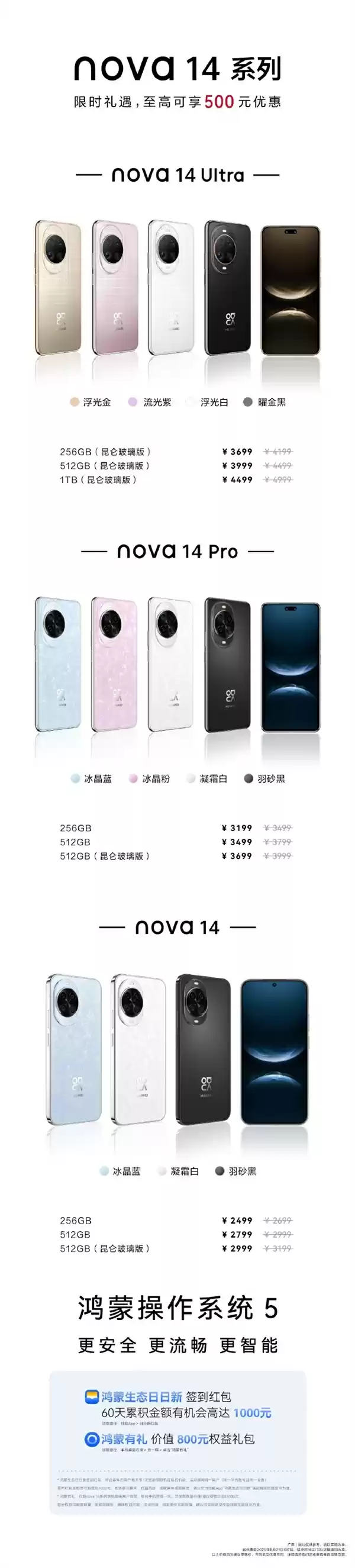 根据官方活动页面信息,nova 14直降200元,优惠后起售价为2499元;nova 14 Pro降价300元,现价3199元起;顶配机型nova 14 Ultra降幅达500元,优惠价3699元起。