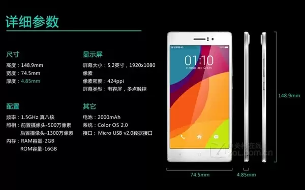 2014年10月发布的OPPO R5,机身厚度4.85mm。该机搭载了骁龙615芯片,2000mAh电池。