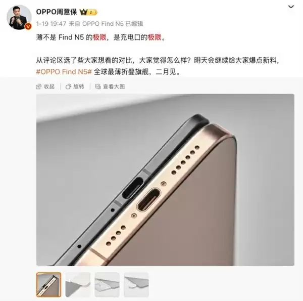目前的折叠屏,展开厚度已经可以做到低于5mm。比如OPPO Find N5,展开厚度只有4.21mm。但这并不是厚度的极限,而是Type-C接口的极限。