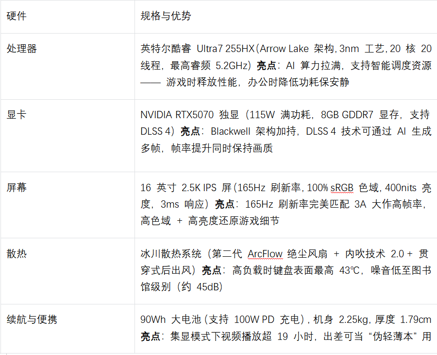 AI 智能调度:Ultra7 255HX 的 NPU 单元会学习用户习惯,办公时自动降低功耗保持安静(风扇噪音几乎可忽略),游戏时瞬间释放性能,实现 “按需出力”;