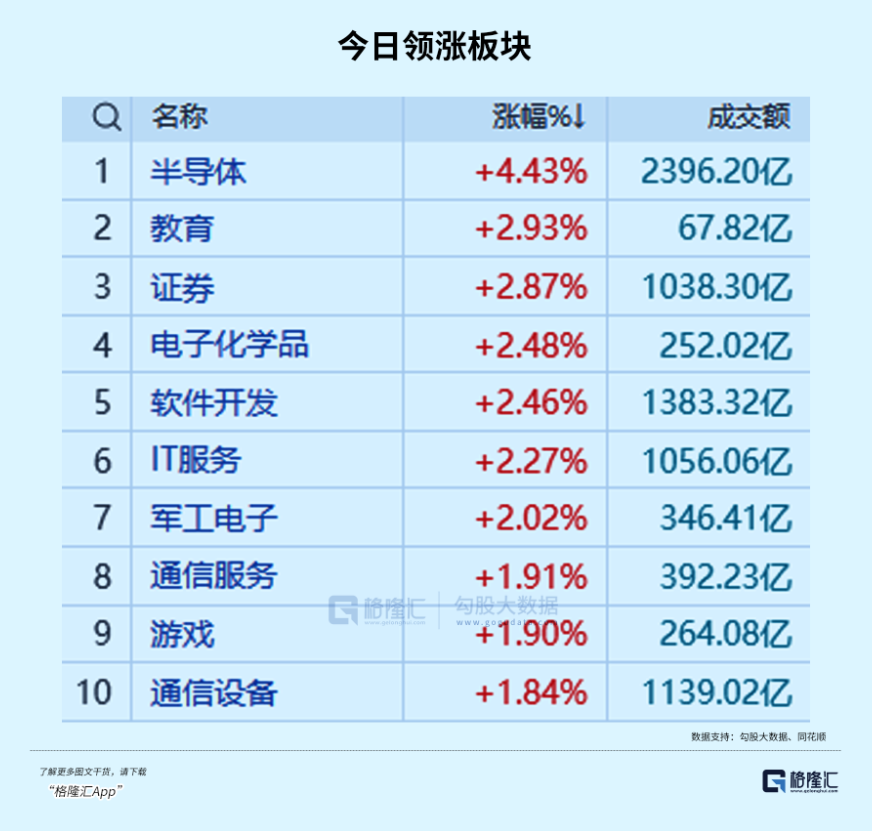 盘面上,芯片、证券、小金属、教育、软件、稀土永磁等板块涨幅居前;化肥、纺织服装、采掘、银行、农业等概念回调。