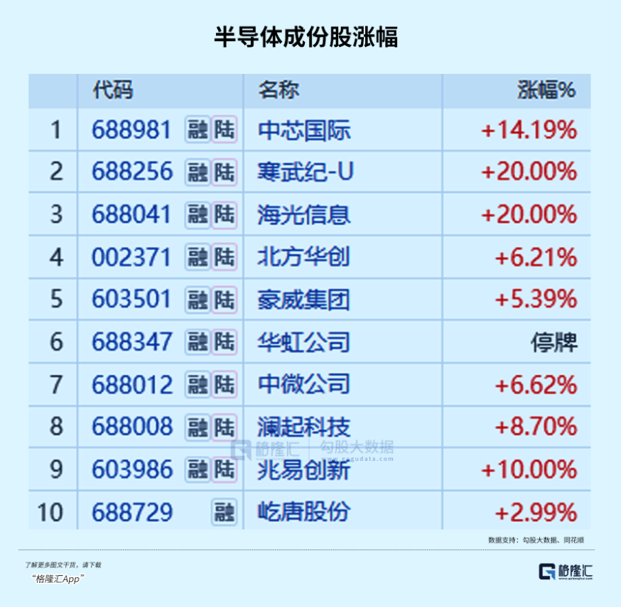 截止收盘,海光信息、寒武纪、盛美上海20cm涨停,芯源微、杰华特、恒烁股份、中芯国际等多股涨超10%。港股半导体也非常强势,华虹半导体涨超15%。
