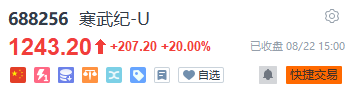 寒武纪直接20cm涨停,市值突破5000亿,股价超过1200元。