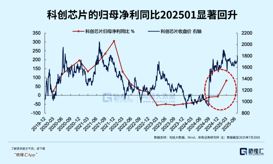 具体来看,科创芯片的归母净利同比在2023年和2024年整体处在底部震荡状态。但从2024年下半年以来,科创芯片自底部开始迎来持续改善。截至2025年O1,科创芯片指数归母净利同比从2024年底的-6.9%提升至83.2%。
