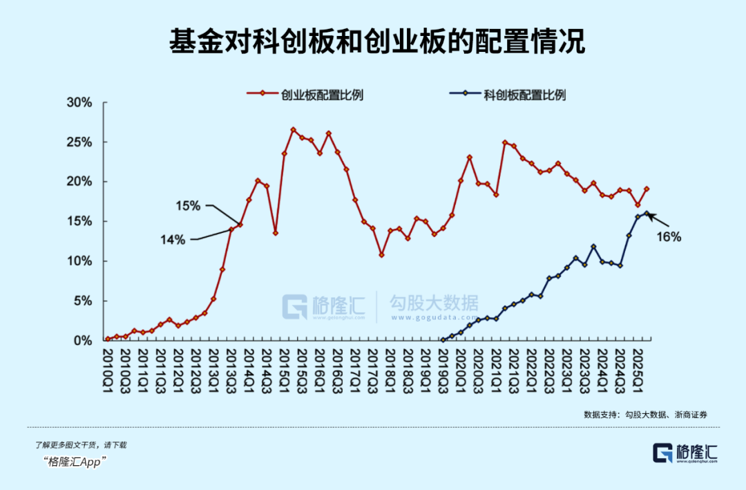 以股票型基金中的普通股票型和混合型基金中的偏股混合型基金为统计样本,截至202501,科创板配置比例达16%。从对比的角度看,截至201303,创业板配置比例占比约14%,可以看出,离2015年创业板的配置高度,还有一定的上升空间。