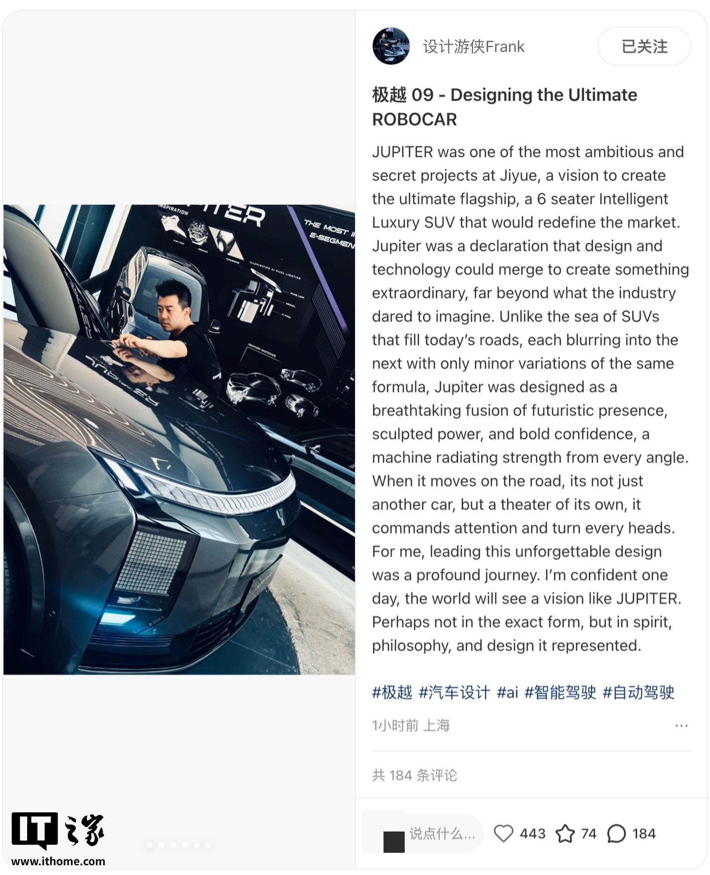 8 月 22 日消息,近日有博主晒出了中大型 SUV 极越 09(代号“JUPITER”)的谍照,随后在今天下午,前极越首席设计官 Frank Wu 通过自己的小红书账号发文,详细介绍了该车的设计思路及灵感。