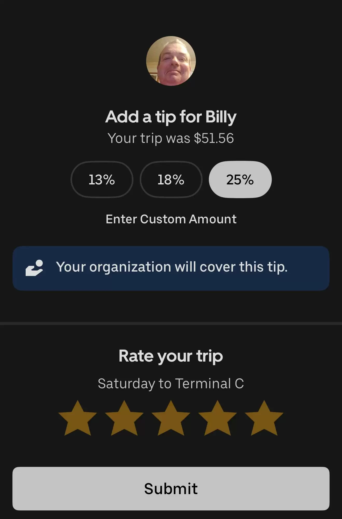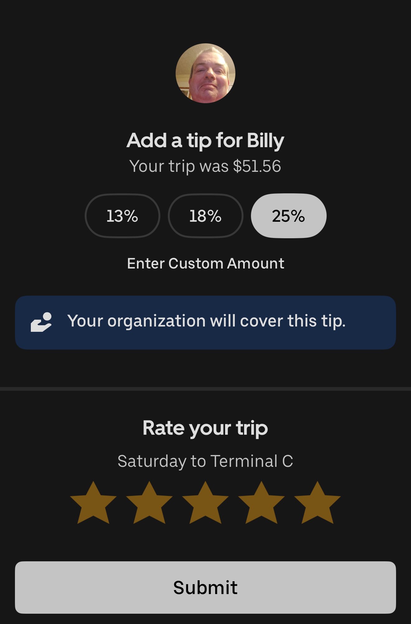 深受感动的 JeebsTX 不仅给了 Billy 五星好评,还特意多支付了 25% 的小费来表达敬意。