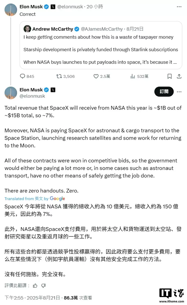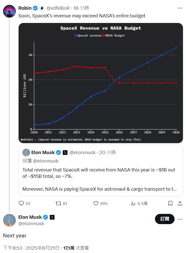 值得一提的是,当网友提出"SpaceX收入或将超越NASA全年预算"的观点时,**马斯克回应称:"这个预测很准确,时间节点就在明年"**。