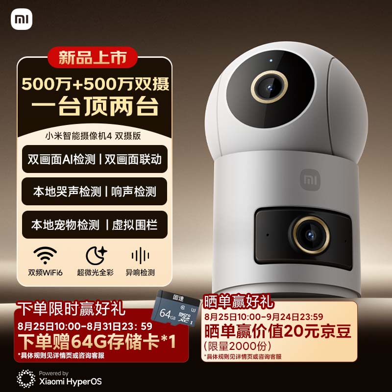 8 月 22 日消息,小米智能摄像机 4 双摄版现已上架京东平台并开启预约,8 月 25 日 10:00 开售,价格为 299 元。