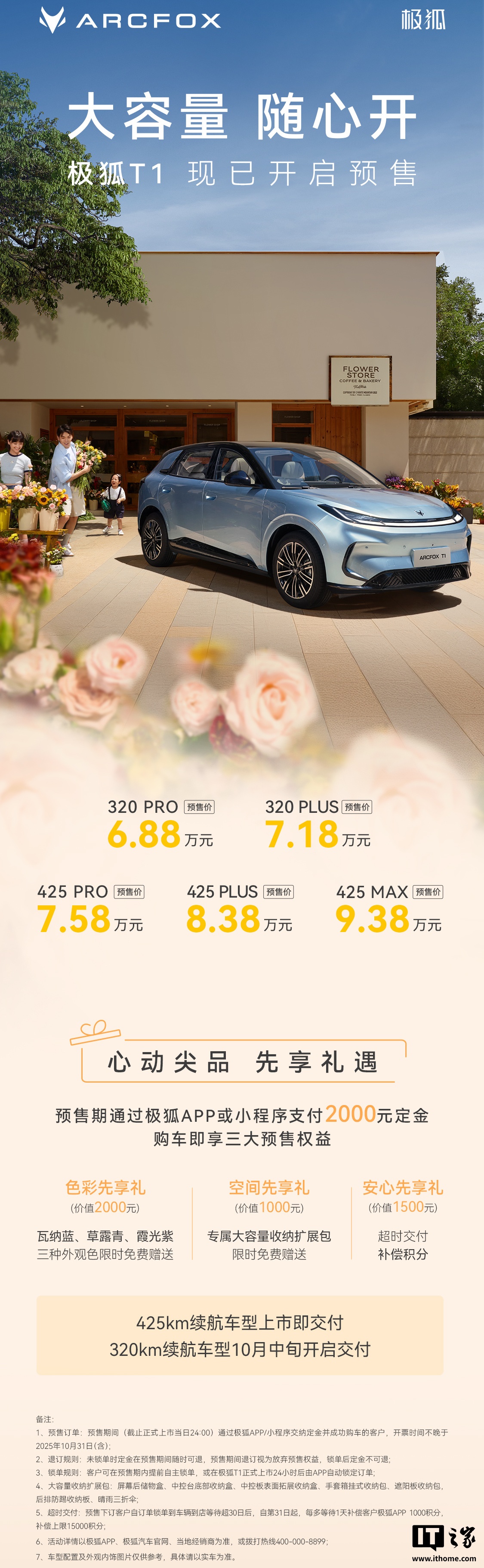 8 月 22 日消息,极狐 T1 纯电小车今日开启预售,新车标配全景影像、提供续航最高 425 公里版本,预售价 6.88 万元起。需要注意的是,极狐 T1 的 425km 续航车型上市即交付,320km 续航车型将在 10 月中旬开启交付。