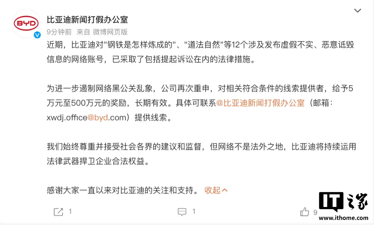 比亚迪对12个发布虚假信息账号采取法律措施