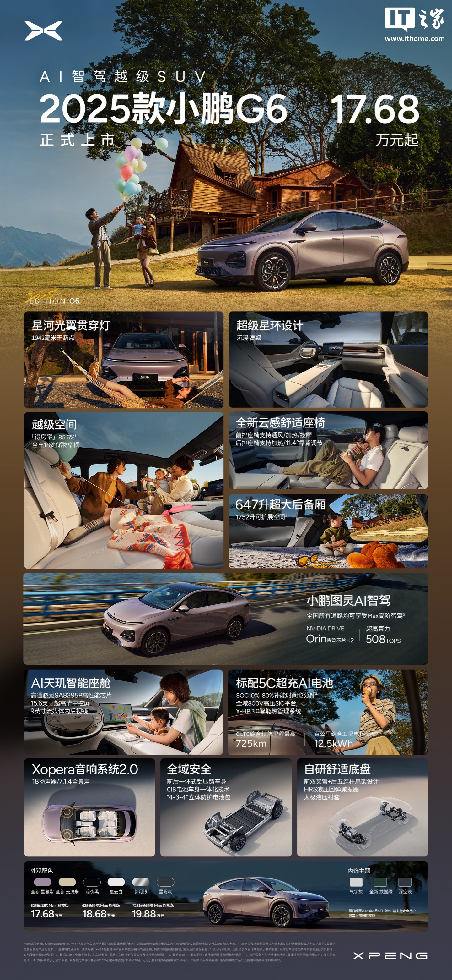 据介绍,全新小鹏 G6 全系标配 5C 超充 AI 电池 + 全域 800V 高压 SiC 碳化硅平台,上市即搭载 AI 天玑 XOS 人机共驾、宠物模式、无麦 K 歌等功能。