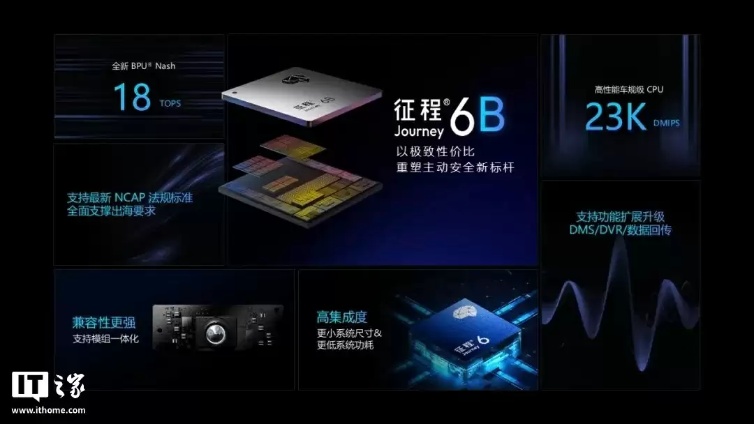 作为参考,今年 7 月 14 日,智能驾驶解决方案厂商地平线宣布,面向入门级主动安全领域的新一代车载智能计算方案 —— 征程 6B 一次性成功点亮。征程 6B AI 算力为 18TOPS,得益于地平线 BPU 纳什架构的加持,征程 6B 可支持 Transformer、光流等主流算法,支持全栈计算任务且“计算性能提升两倍以上”。