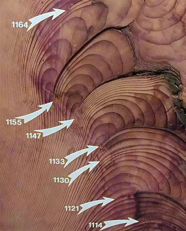 △ 海岸红杉的焚烧痕迹在年轮中体现