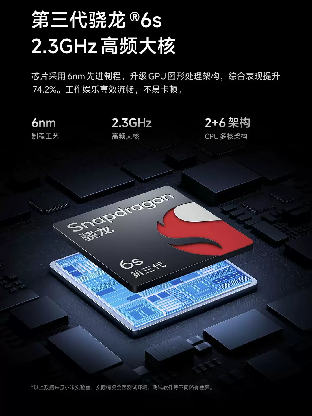 新机提供冰川白、暗影黑、流沙紫三种配色可选,重约 217g,厚约 8.4mm,搭载第三代高通骁龙 6s 移动平台(6nm 工艺,2.3 GHz),采用 LPDDR4X 内存 + UFS 2.2 闪存,配备 7000mAh 金沙江电池(五年耐用),支持 33W 快充及 18W 有线反向充电。