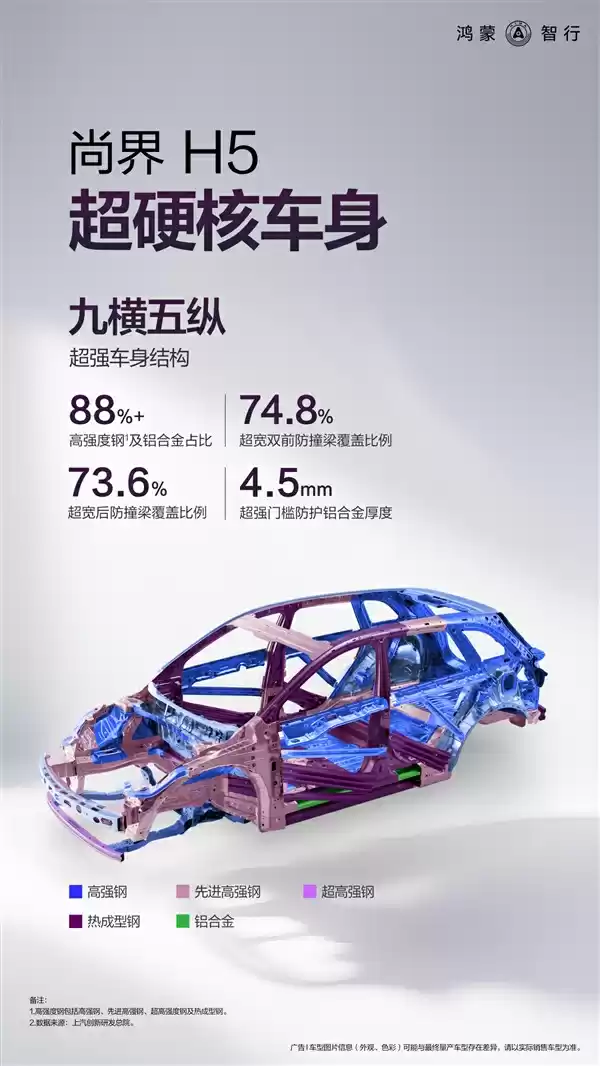 据介绍,新车以九横五纵超强车身结构打造“钢铁堡垒”,高强度钢及铝合金占比超88%。
