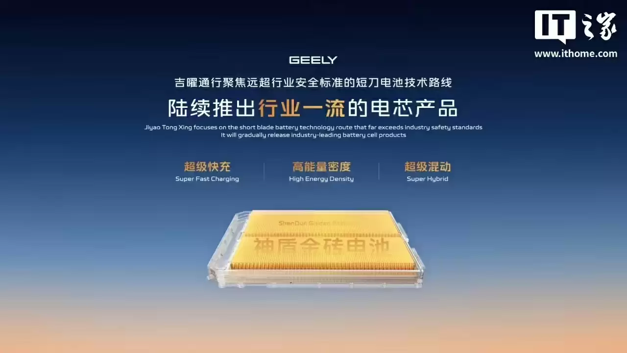 今年4月,吉利整合旗下电池业务成立“吉曜通行”品牌,将原有的金砖电池与神盾短刀电池技术路线统一整合为神盾金砖电池品牌。官方阐释,“神盾”承载着吉利对电池安全体系的极致追求,“金砖”则象征着行业领先的电芯技术实力。现阶段,神盾金砖电池超级混动系列已具备超安全防护、超快速充电、超倍率性能与超长使用寿命四大技术优势,未来将陆续应用于极氪、领克、银河等吉利旗下主力品牌。