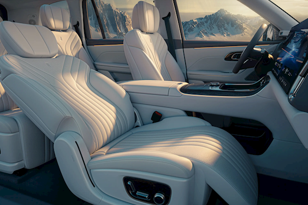 座椅采用打孔真皮材质,中央通道后方设有一个大尺寸的扶手箱,第二排为两个独立航空座椅,过道宽度有180mm,配备无缝腿托、腰托,具备通风、加热、10点按摩。