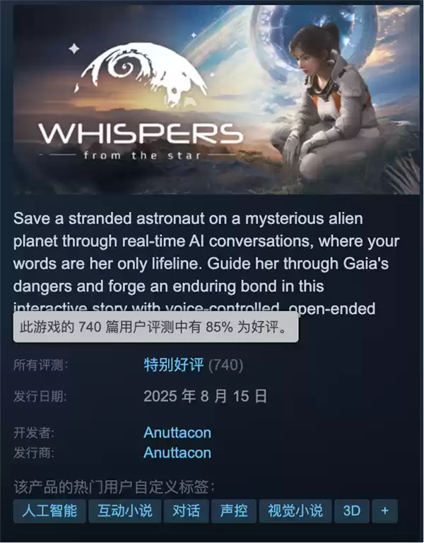 8 月 15 日,原神之父蔡浩宇的新游戏《Whispers from the Star》(下译作《星之低语》)正式在 steam 上线了。