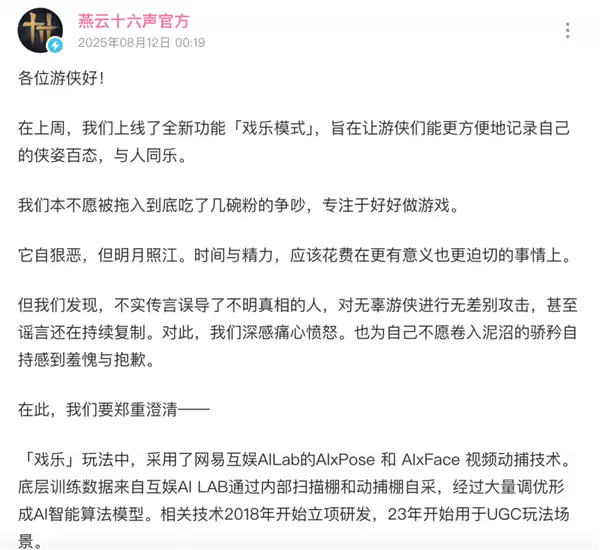 还有最近吵挺大的《逆水寒》和《燕云十六声》“内斗”,这事的起因就是有玩家质疑燕云抄了逆水寒的 AI 玩法。