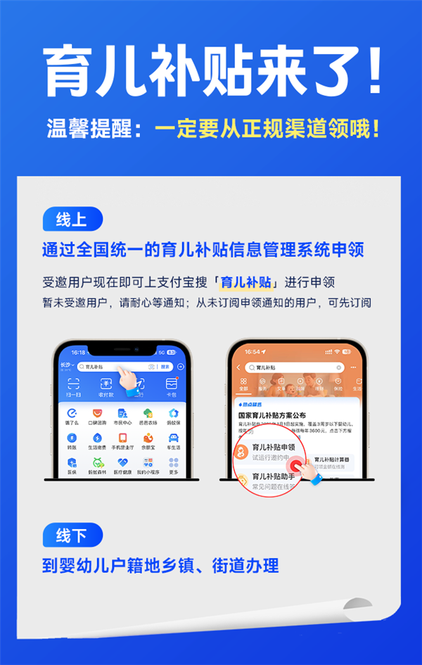 线上:通过全国统一的育儿补贴信息管理系统申领。各地省级政务服务平台设置育儿补贴申领专区,同时在支付宝等平台开通了育儿补贴申领入口;