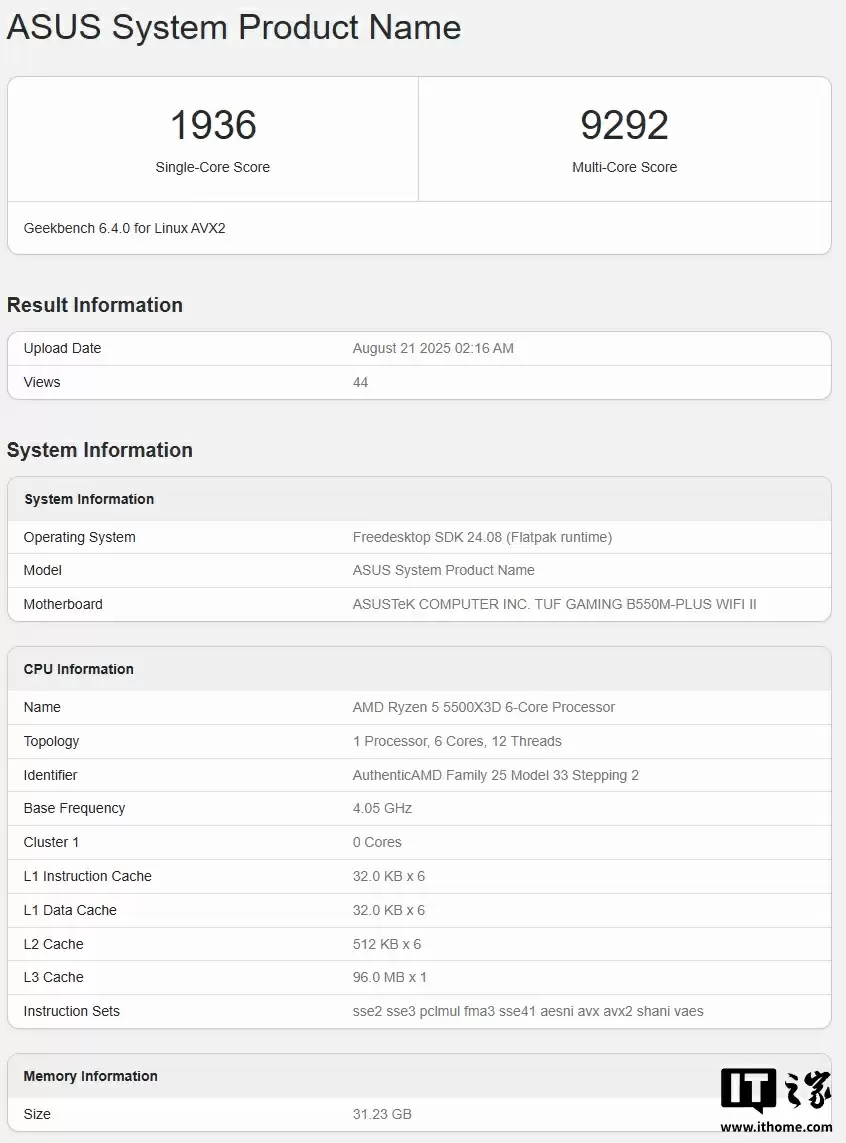 注意到,本周四华硕有一款搭载锐龙 5 5500X3D 处理器的测试平台出现在了 Geekbench 上,采用 Flatpak 虚拟化环境,配备 32GB 内存,单核测试得分 1936 分,多核测试得分 9292 分。