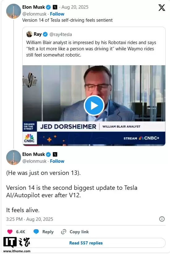 注意到,马斯克在 X 社交平台上进一步分享了 FSD V14 的细节。在回应一位威廉・布莱尔分析师发布的视频时,该分析师提到特斯拉的 Robotaxi 服务相比 Waymo 的机器人操作,更像有人在驾驶。对此,马斯克表示:“特斯拉自动驾驶的第 14 版感觉像是有感知能力的。”