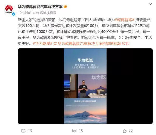 同时,华为官方还宣布华为乾崑智驾迎来了四大里程碑:搭载量已突破100万辆,华为激光雷达累计发货量破100万,车位到车位领航辅助P2P功能已累计使用1000万次,累计辅助驾驶行驶里程达到40亿公里。