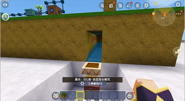 3、在水沟中央放上感应方块并连接电路至机械臂,再在前方挖上一个小池子