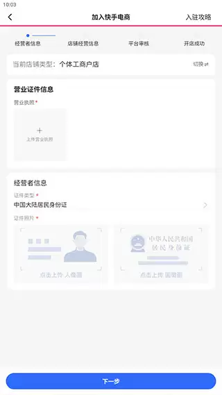 5、进入快手电商入驻页面后,仔细阅读平台规则,随后填写店铺详细信息并上传所需证件材料