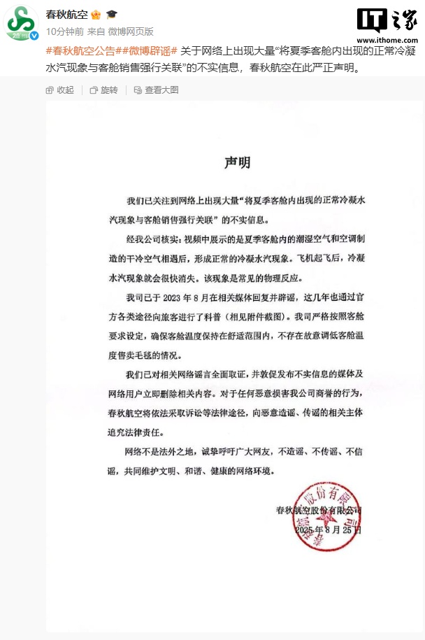 8 月 25 日消息,春秋航空今日发布声明:公司关注到网络上出现大量“将夏季客舱内出现的正常冷凝水汽现象与客舱销售强行关联”的不实信息。