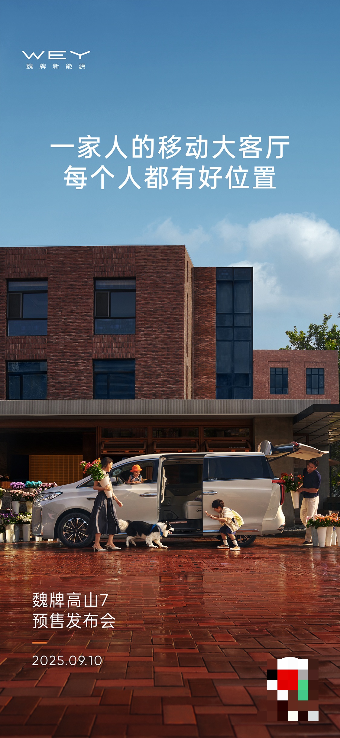 8 月 25 日消息,长城汽车定位“一家人的移动大客厅”的 MPV 新车 —— 魏牌高山 7 预售定档 9 月 10 日。